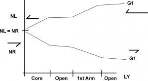 If you start at the far right and follow the top curve, to the left, the number of G1 particles decrease. When you reach the center of the core then NL is again the same as NR. It becomes very clear that there is a compounding effect on the force of gravity as you move from the core though the galactic plane, gaining in one direction and losing in the other.