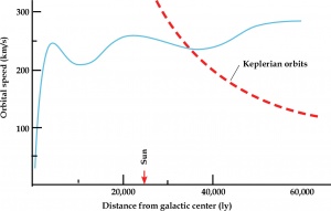 In <xr id="fig:blue-curve"/> , the blue line is the measured value and the red line is the calculated value. It is clear from <xr id="fig:blue-curve"/> the measured value is too high when the distance is below 35,000 Light Years (LY) and it is too low above that distance. It is the part that is too low that seems to cause the scientists problems. Other graphs of the orbital speed are shown in Figure <xr id="fig:blue-curve-OSU"/> and <xr id="fig:blue-curve-AU"/> .