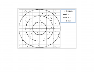 In each case, only the galaxies within the innermost circle of radius 1 are visible. Any galaxies outside that circle are actually outside the observer's view and, therefore, of unknown existence (being shown in Figure <xr id="fig:four"/> , Figure <xr id="fig:five"/> and Figure <xr id="fig:six"/> just to indicate that the number of galaxies originally contained within the smallest universe has been maintained constant). This observational limit is illustrated in Figure <xr id="fig:three"/> . Figure <xr id="fig:four"/> , Figure <xr id="fig:five"/> and Figure <xr id="fig:six"/> show the results from one of the five sets of simulations for the expanding universe (highlighted in bold italics in Table 2 [Figure <xr id="fig:seven"/> ]).